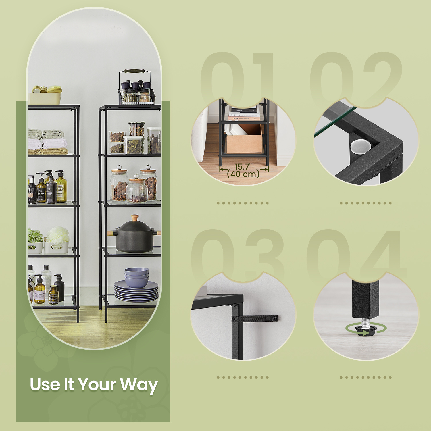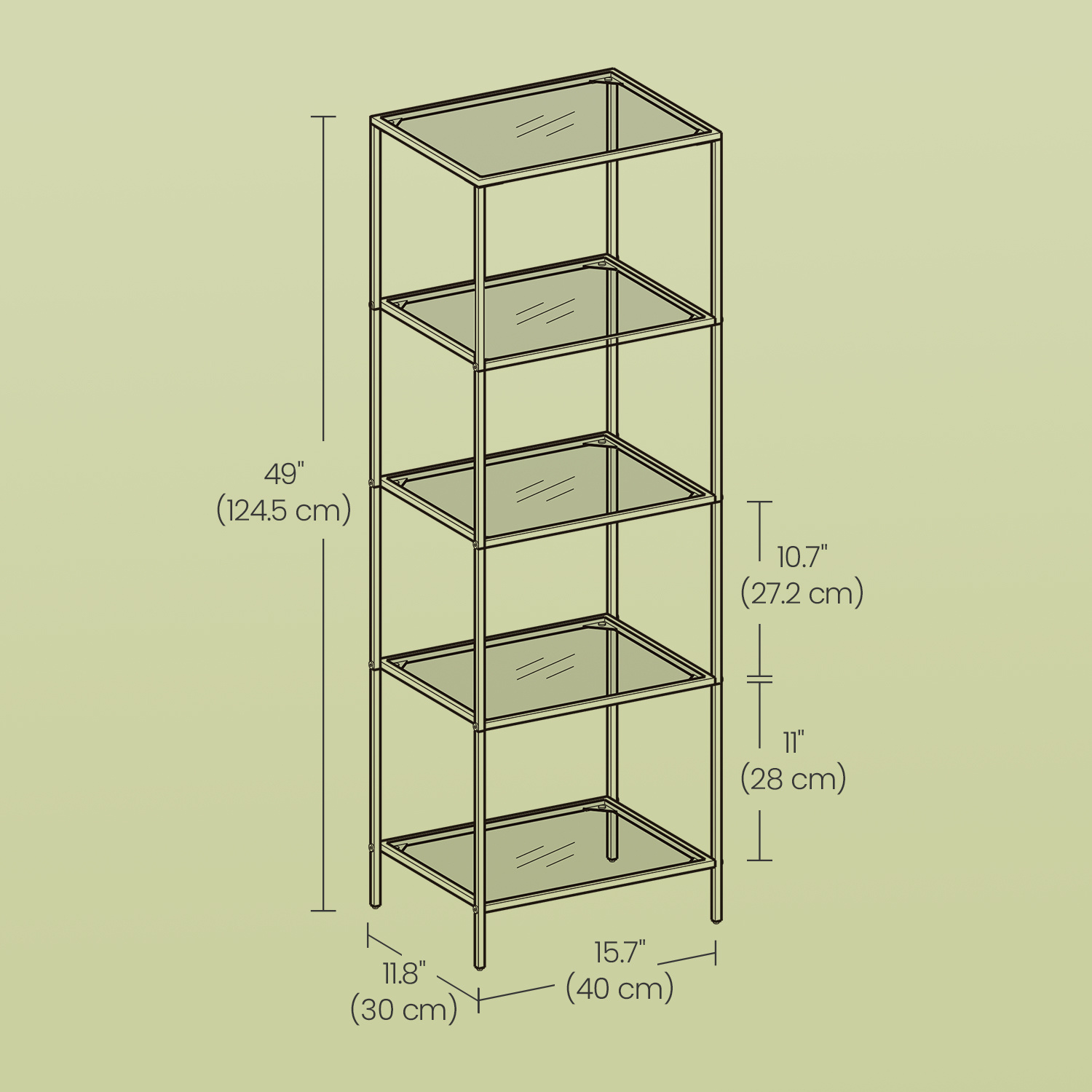 Parameters: - Product Dimensions: 11.8""D x 15.7""W x 49""H (30 x 40 x 124.5 cm) - Net Weight: 18 lb (8.2 kg) - Max. Weight Capacity of Each Shelf: 22 lb (10 kg) - Total Max. Weight Capacity: 110 lb (50 kg) - Material: Tempered Glass, Steel Package List: - 1 x Storage Rack - 1 x Anti-Tip Kit Notes: - Secure the rack to the wall with the included anti-tip kit. - Children cannot climb or play on the storage rack for safety reasons.