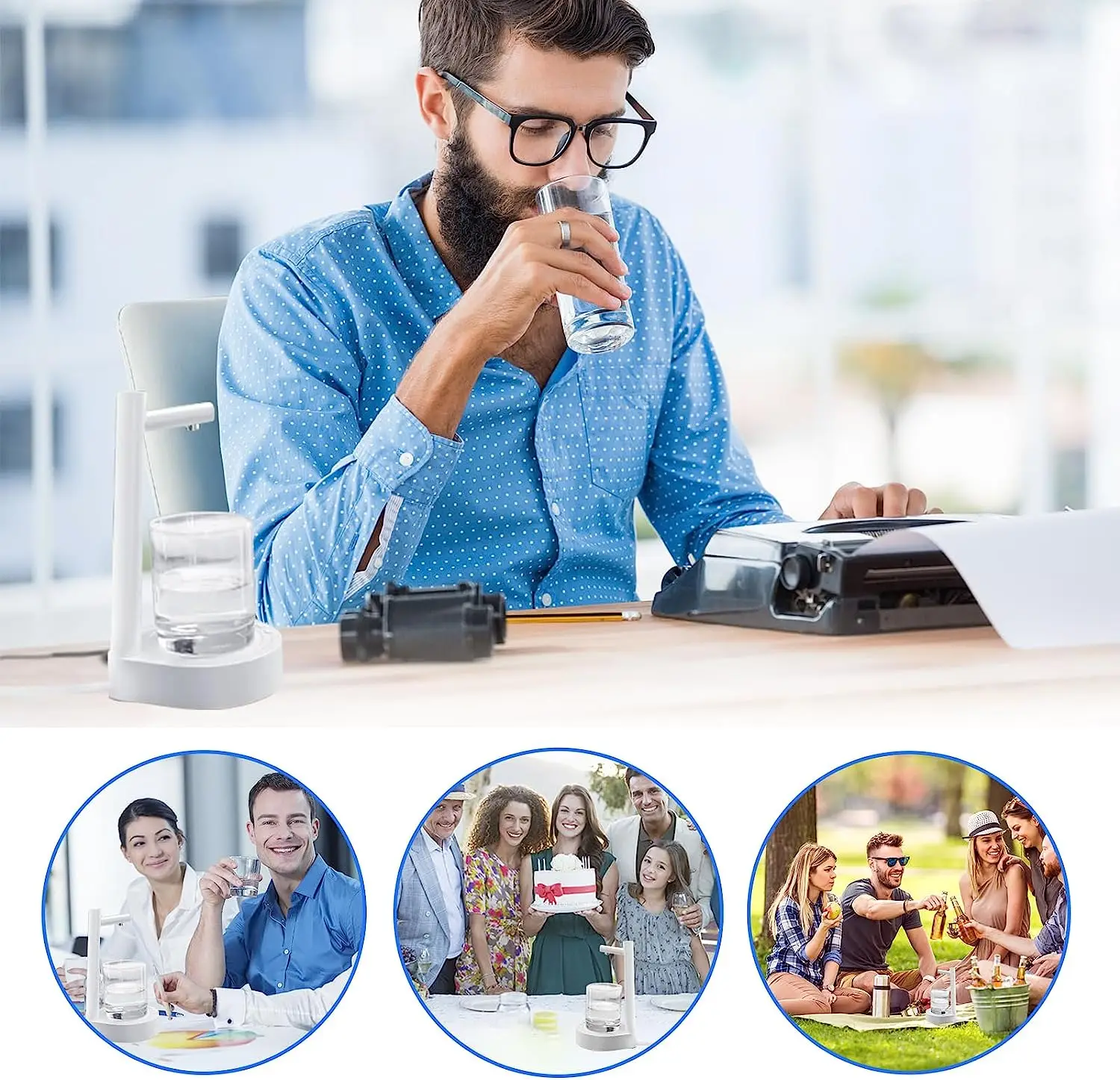 For Indoor & Outdoor: Smart table water dispenser comes with 1 water hose, 1 USB charger cable, 1 user manual. Water desk dispenser's compact size and light weight make it ideal for camping, party, homes, and more. Desktop water dispenser has characteristics of intelligent control of water volume and low noise. Matching bucket dust lid protect drinking water from pollution, is perrty practical.