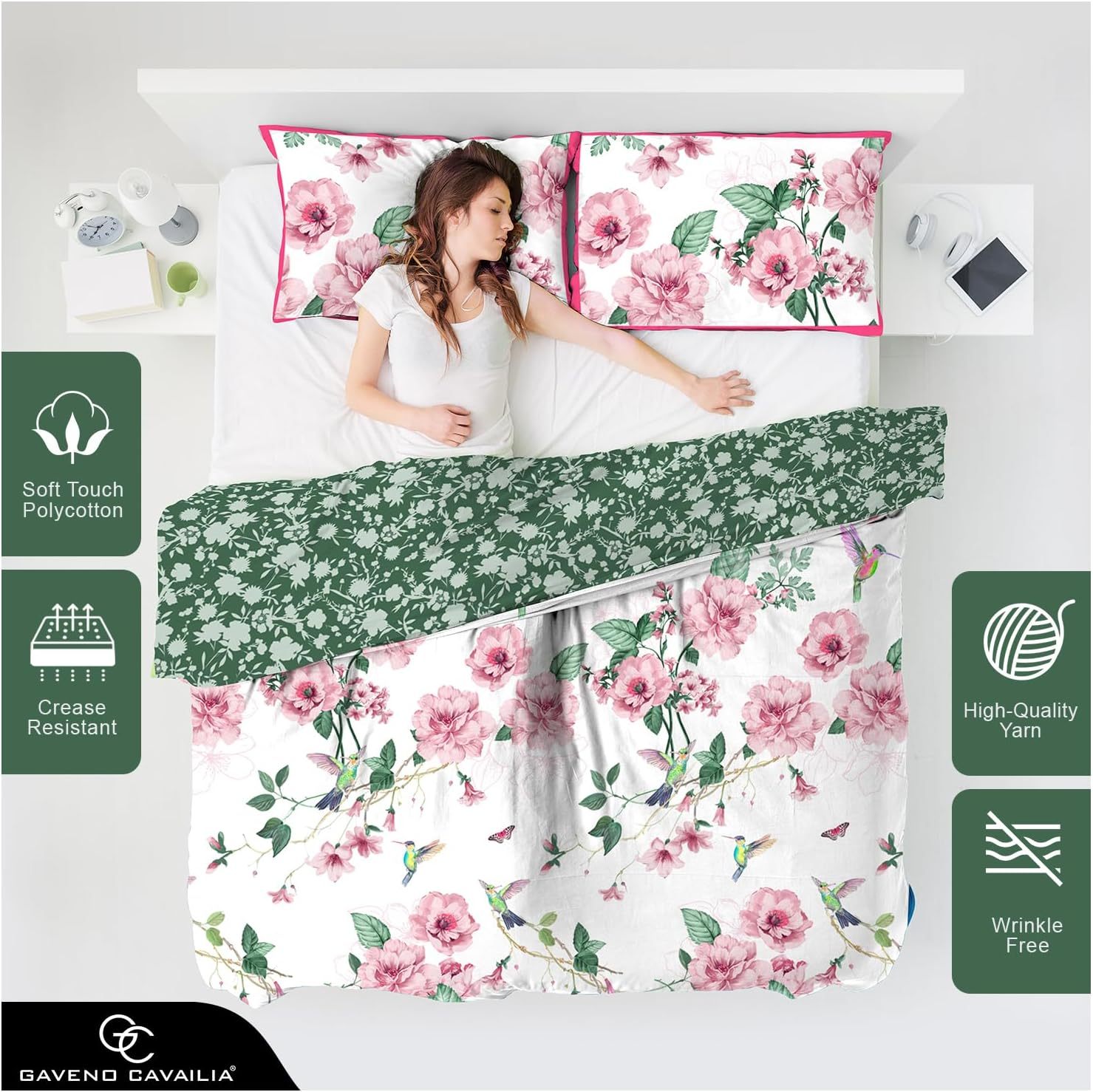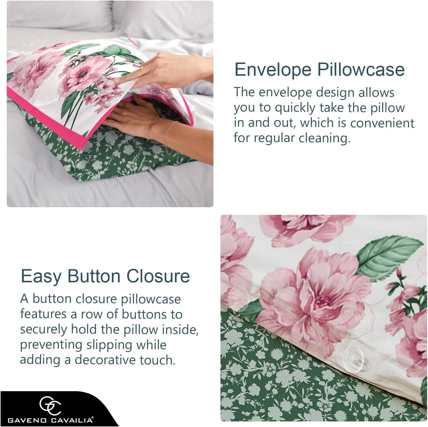 Add a splash of botanical charm to your bedroom with the GC GAVENO CAVAILIA Botanical Leaf Duvet Set available in Single, Double & King Sizes. Crafted from a soft and durable polycotton blend, this reversible bedding features delicate floral blossoms in pink and green tones. A secure button closure keeps your duvet in place, while easy-care fabric ensures lasting beauty. Complete with matching envelope pillowcases, it’s a stylish and practical choice for a fresh bedroom update. Material Composition: Polycotton (50% cotton, 50% Polyester) Available Size: Single, Double & King Single: 137x200 cm Double: 200x200 cm King: 230x220 cm Duvet Set includes: Single: 1 Duvet cover & 1 Pillow Case Double: 1 Duvet cover & 2 Pillow Cases King: 1 Duvet cover & 2 Pillow Cases Care Instructions: Machine washable at 40 degrees C. Do not bleach. do not dry clean. Tumble dry at low temperature. Steam ironing may be a risk.