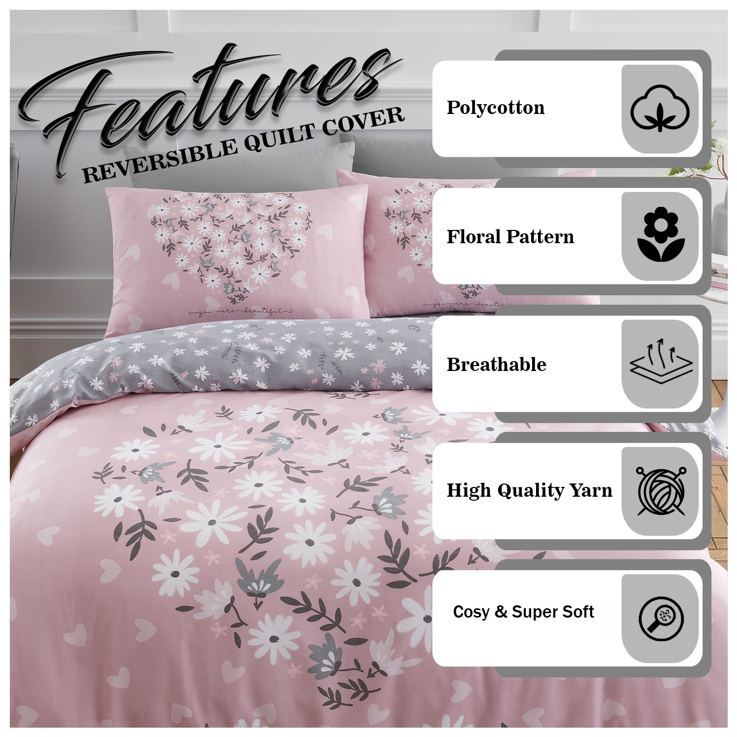 · Romantic Floral Heart Design: Add a touch of love and beauty to your bedroom with this Ditsy Heart duvet cover set. The elegant front features a large heart formed by delicate flowers, surrounded by tiny heart shapes, all set against a soft blush pink background for a sweet, inviting look.