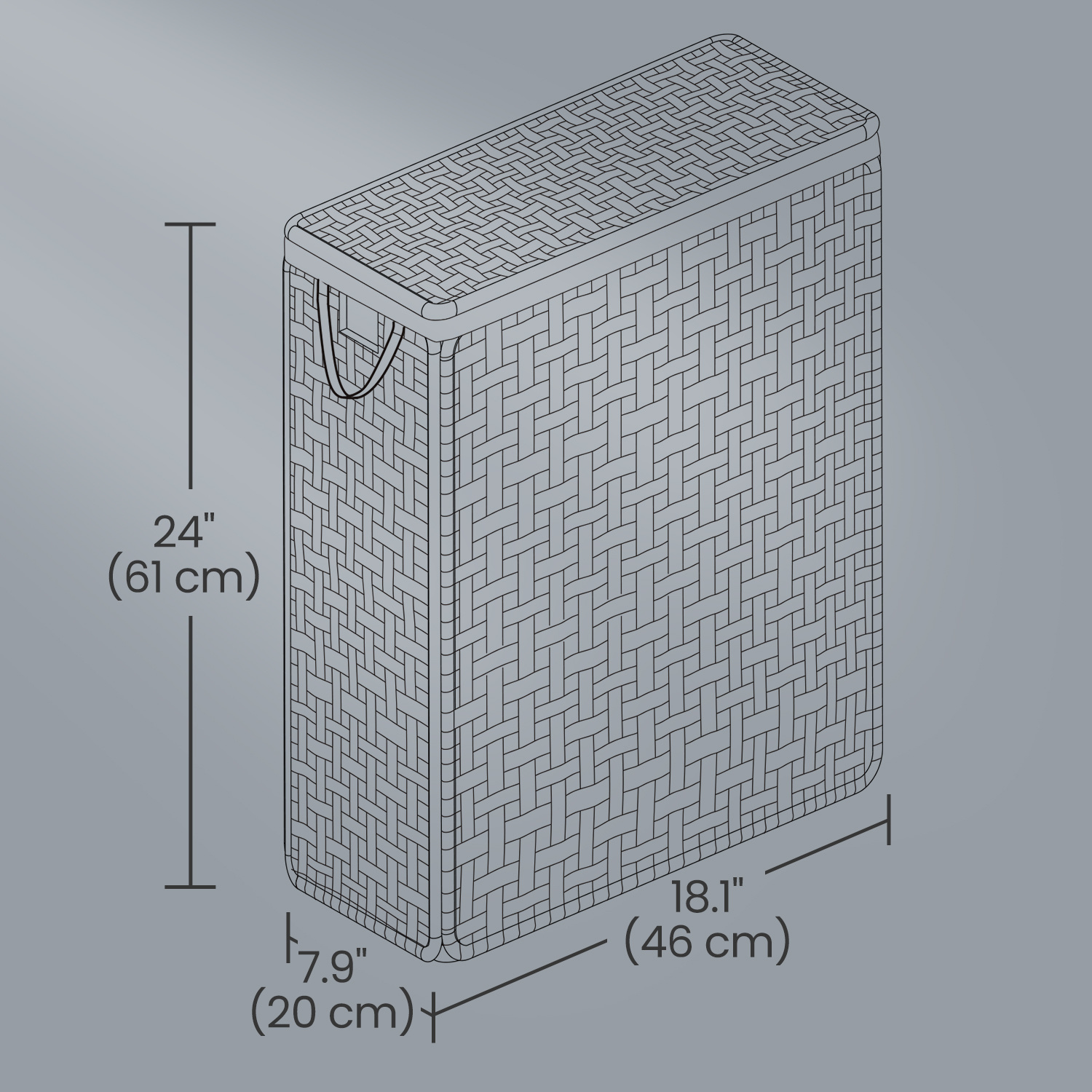 Parameters: - Product Dimensions: 18.1”L x 7.9”W x 24”H (46 x 20 x 61 cm) - Net Weight: 5.5 lb (2.5 kg) - Max. Static Weight Capacity: 33 lb (15 kg) - Material: PP (Polypropylene) Plastic Rattan, Metal Frame, Polycotton Liner Package List: - 1 x Laundry Basket with Lid