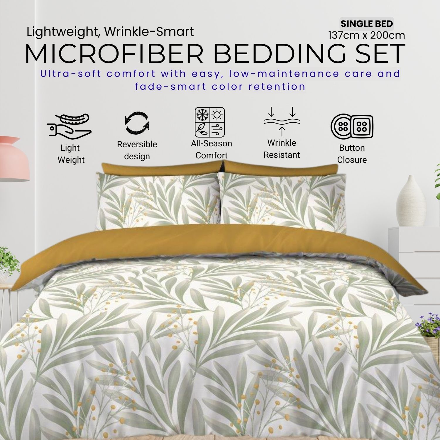 Transform your bedroom into a serene retreat with the GC Microfiber Duvet Cover Bedding Set. Designed with a charming Leaf print and a reversible solid color, this set adds style and versatility to your space. Crafted from high-quality microfiber for a smooth, lightweight, and wrinkle-resistant finish, it offers comfort throughout all seasons. The secure button closure keeps your duvet in place, while the fade-smart colors ensure lasting vibrancy wash after wash. Perfectly sized for Single, Double, and King beds, it’s the ideal choice for a refreshing bedroom update. Dimensions (cm):