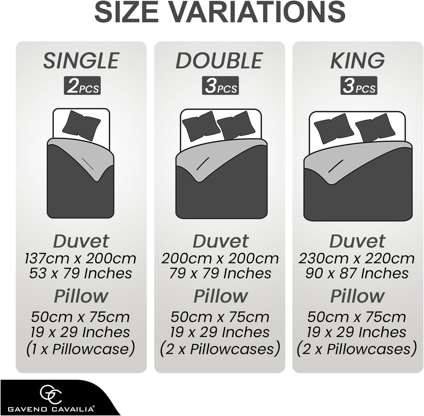 · Available in Double & King Sizes: The duvet cover set is available in Double (200x200 cm / 79x79 inches) and King (230x220 cm / 90x87 inches) sizes. Both sizes include a duvet cover and two pillowcases (50x75 cm / 19x29 inches), offering a perfect fit for various bed sizes.