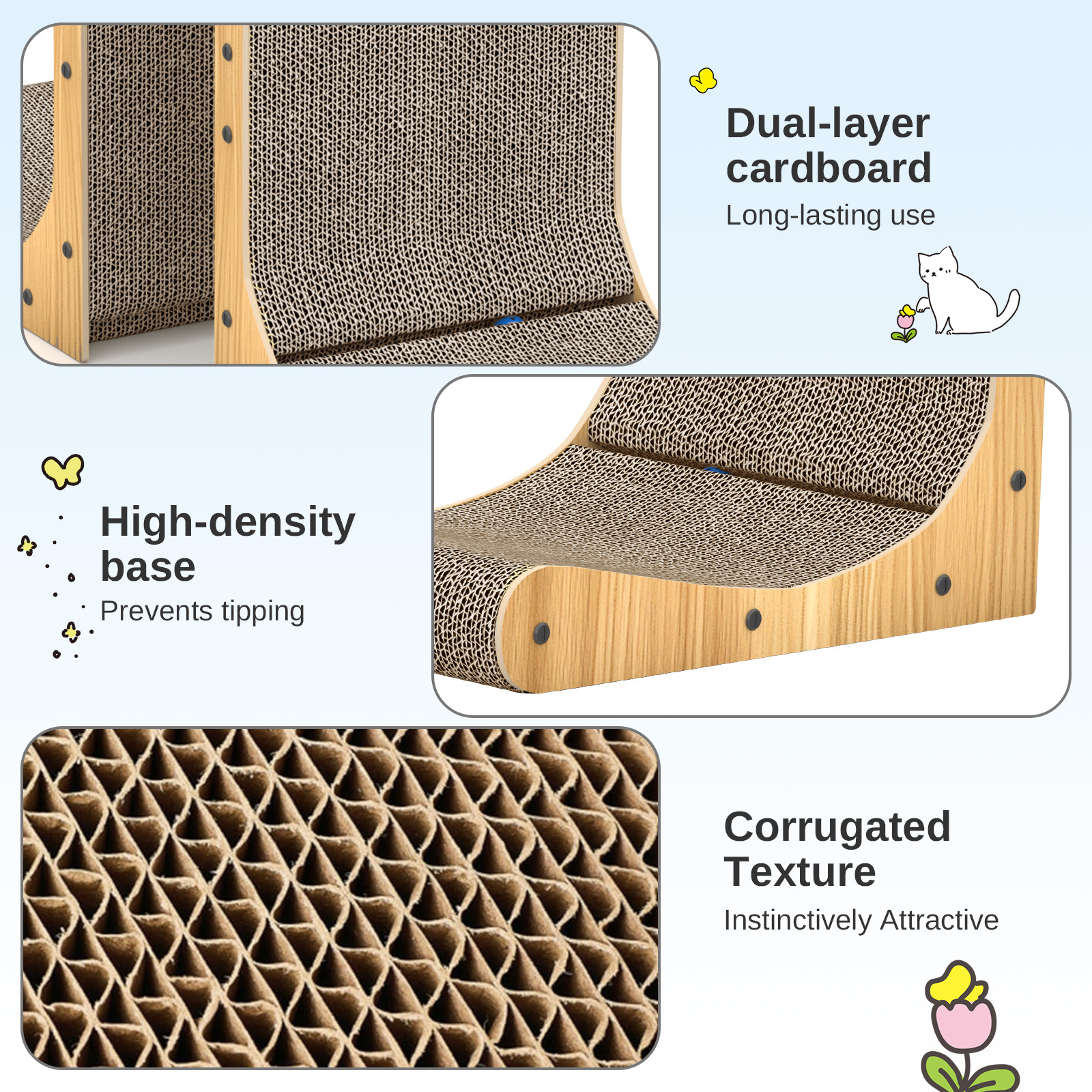 · Durable & Long-Lasting: Made with dual-layer corrugated cardboard and a high-density base, it’s super (abrasion-resistant) to withstand endless scratching—lasts way longer than ordinary scratchers.