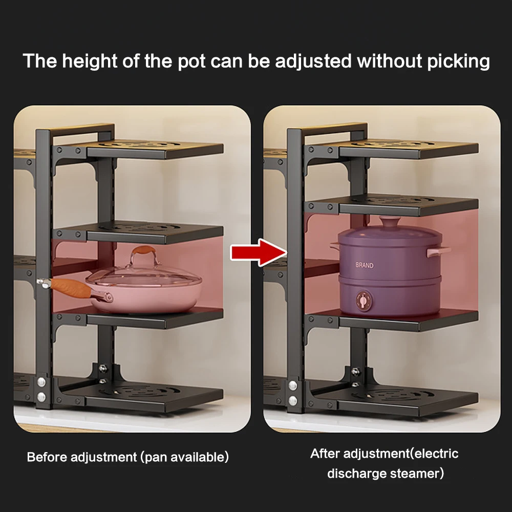 This pot rack offers a more convenient and enjoyable cooking experience. Crafted from high-quality carbon steel, it offers robust durability and high load-bearing capacity for long-lasting. The unique 180°open-access design provides users with the ease of multi-angle retrieval, significantly improving cooking efficiency. With a two-tier structure, it not only categorizes your cookware but also aids in maintaining a neat kitchen environment. Moreover, the widened and adjustable shelves accommodate various sizes of pots and pans, effortlessly meeting diverse storage needs.