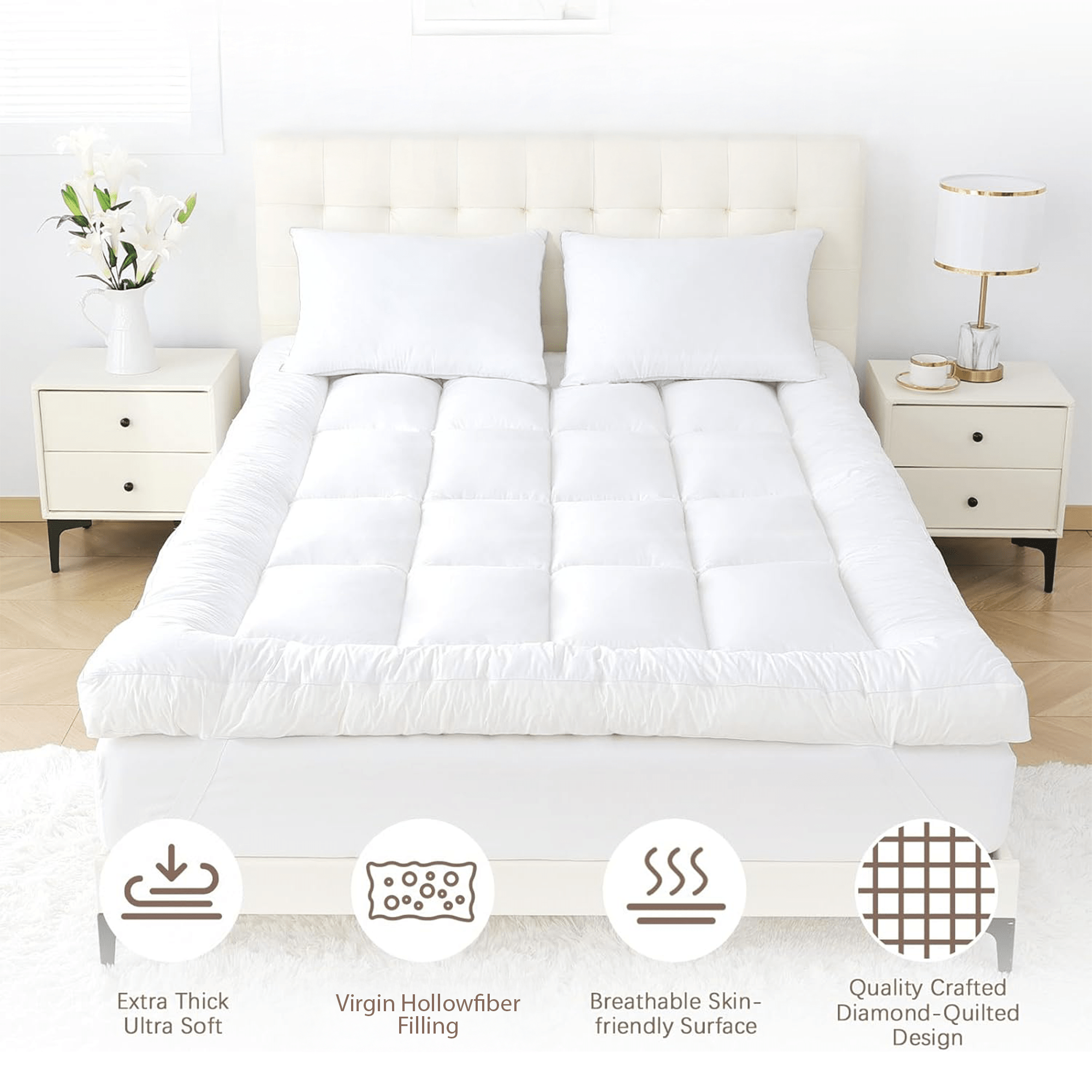 PREMIUM DESIGN: Encased in the softest, lightest, and most breathable microfiber for optimal relaxation, our mattress topper also features a new, neat, and stylish quilted design. Filled with 6D premium quality plush virgin hollowfiber, this mattress topper has been specially crafted for improved relaxation