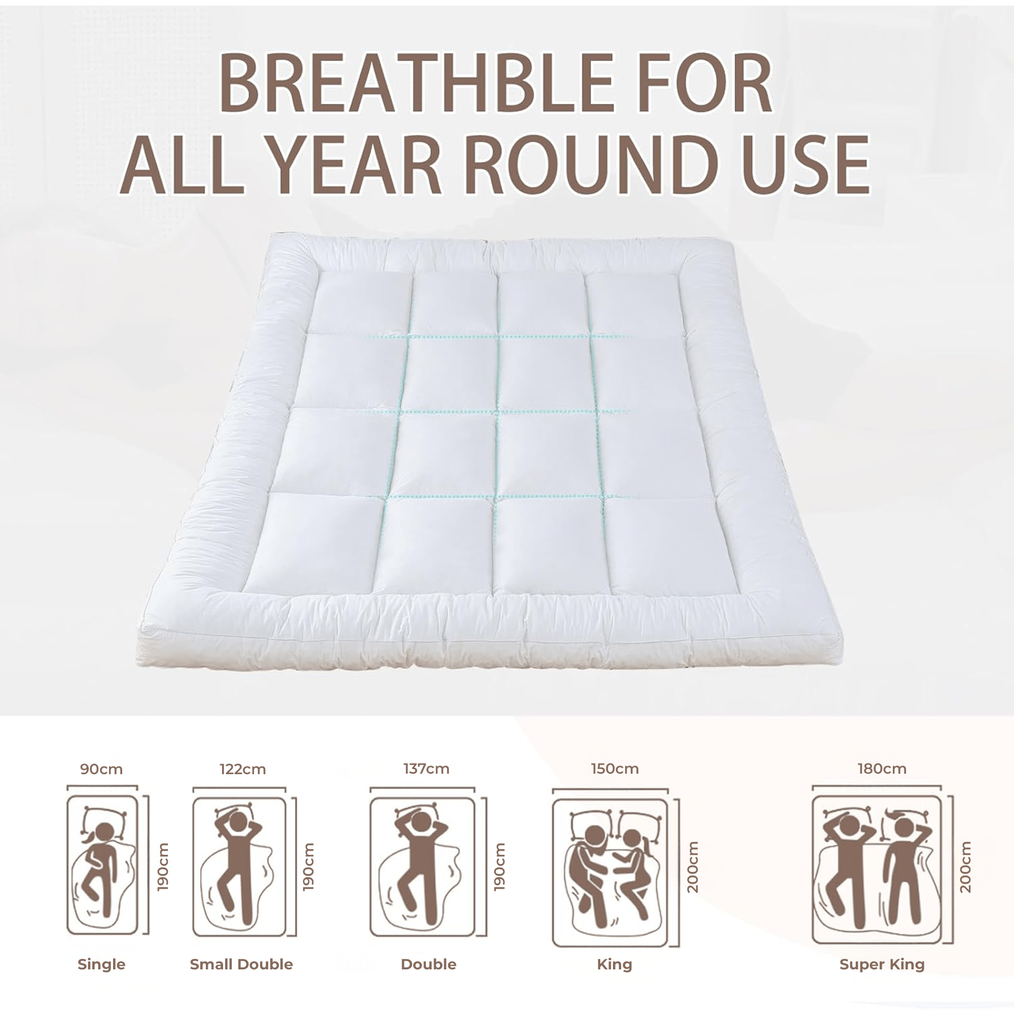 · PREMIUM DESIGN: Encased in the softest, lightest and breathable microfiber for optimal relaxation, our mattress topper also features a new, neat and stylish quilted design. Filled with 6D premium quality plush virgin hollowfiber, this mattress topper has been specially crafted for improved relaxation.