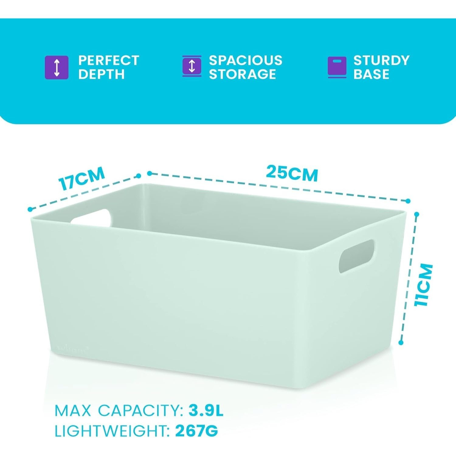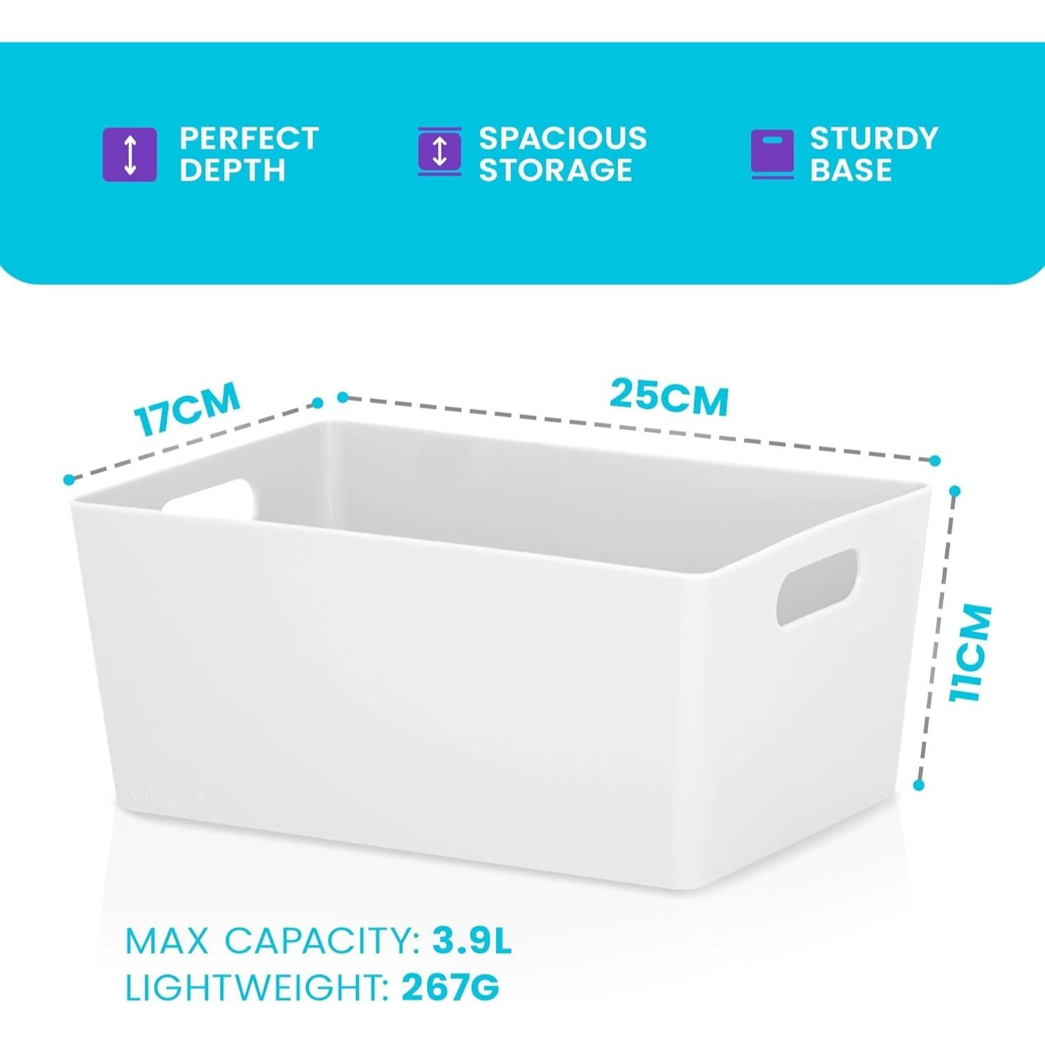 Transform any space into organised elegance with these versatile 3.9L storage baskets. Whether you're tidying up the kitchen, bathroom, laundry, or utility area, these baskets help you create a clutter-free, easy-to-maintain environment that promotes a sense of calm and order. Optimally sized for compact storage, each basket measures 17cm x 25cm x 11cm—offering ample room for your everyday essentials while easily fitting into tight spaces like cupboards, drawers, or shelving units. Their lightweight design, at just 267 grams, makes handling and repositioning effortless, perfect for multi-purpose use around the home. Designed with a modern, minimalist aesthetic, these baskets seamlessly blend with any home décor. Whether you're organising craft supplies, makeup, cleaning products, or pantry items, they add a touch of clean style and functionality to any room. Built for durability and convenience, each basket is made from high-quality plastic with sturdy handles for easy lifting and carrying. Their stackable design makes storage more space-efficient and helps keep frequently used items easily accessible on shelves or inside cupboards.