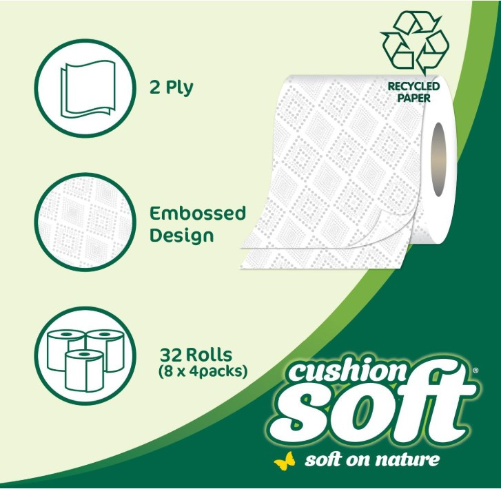· 32 x 2ply rolls from recovered paper; in handy packs of 4, wrapped in 30% recycled LDPE.