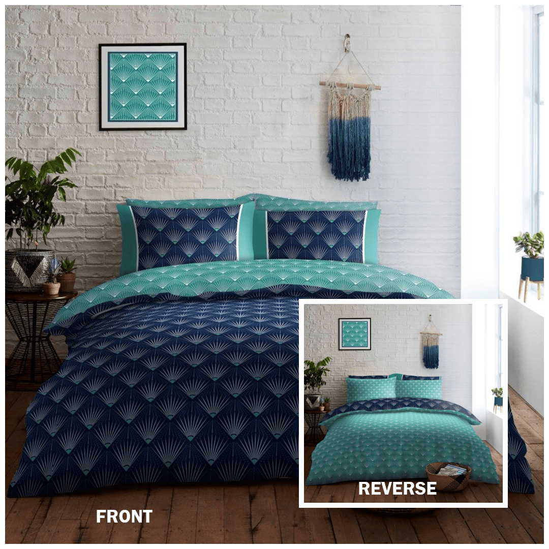Transform your bedroom into a relaxing retreat with this stylish reversible bedding set. Featuring a modern geometric pattern in deep blue and teal hues, this duvet cover adds a refreshing touch to your space. The set includes a soft and cozy comforter and matching pillowcases, designed for ultimate comfort. Whether you prefer the striking pattern on the front or the solid teal reverse side, this bedding set offers versatility and style. Crafted for durability and easy care, it’s an ideal addition to any modern bedroom. Material Composition: Polycotton (50% cotton, 50% Polyester) Available Size: Single, Double & King Single: 137x200 cm Double: 200x200 cm King: 230x220 cm Duvet Set includes: Single: 1 Duvet cover & 1 Pillow Case Double: 1 Duvet cover & 2 Pillow Cases King: 1 Duvet cover & 2 Pillow Cases Care Instructions: Machine washable at 40 degrees C. Do not bleach. do not dry clean. Tumble dry at low temperature. Steam ironing may be a risk.